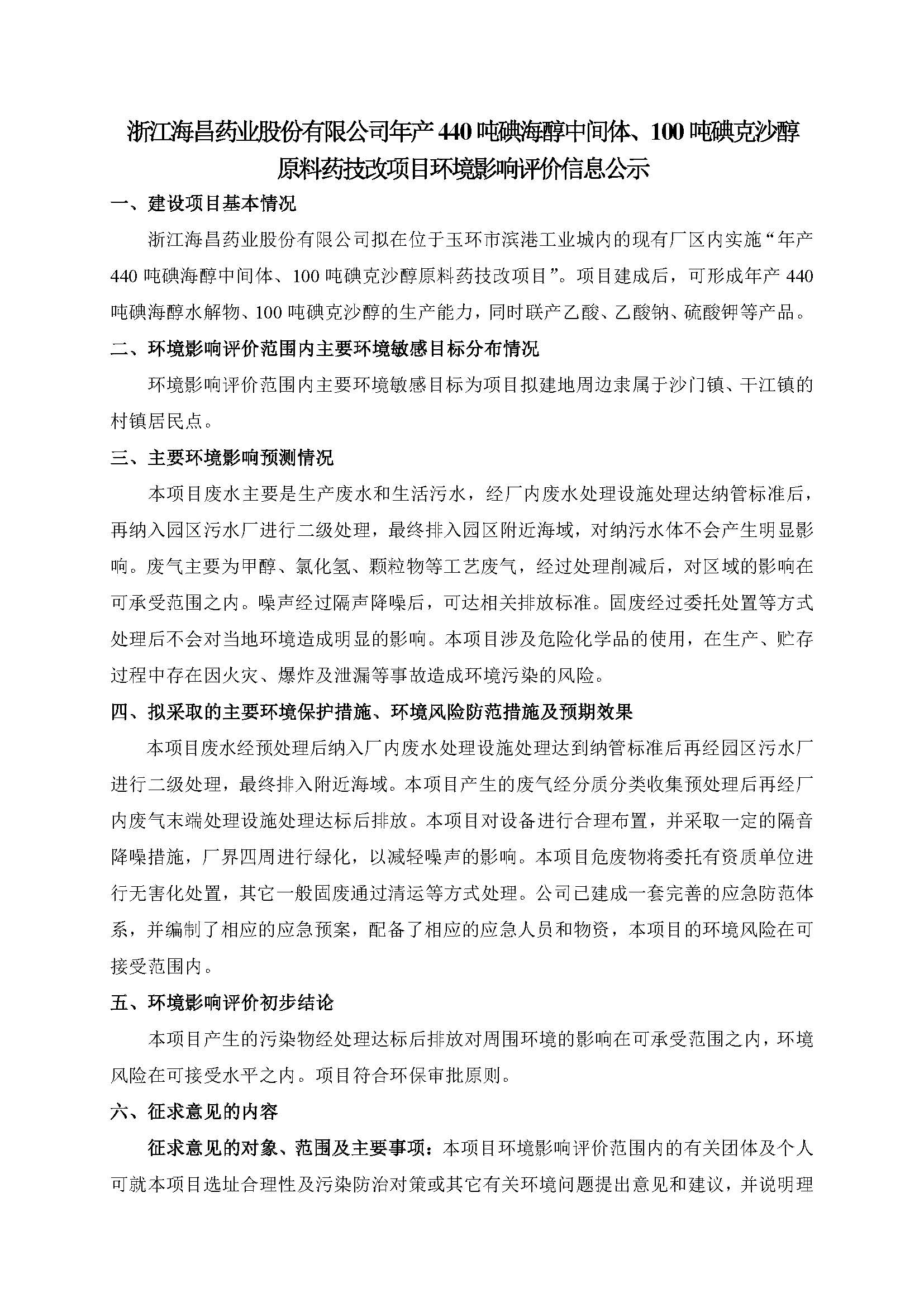 Environmental impact evaluation publicity of technical improvement projects on Zhejiang Hichi Pharmaceutical Corporation Limited“Annual output of 440 tons Iohexol intermediates & 100 tons Iodixanol API”
